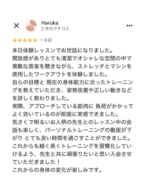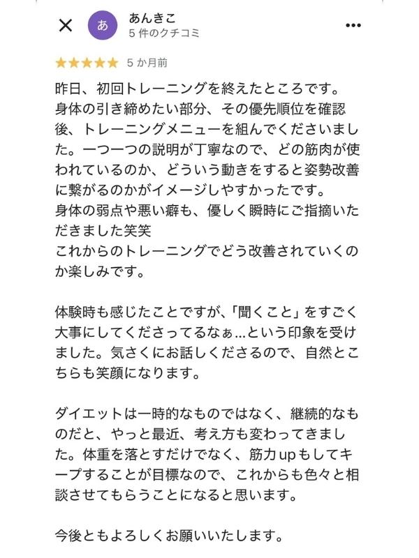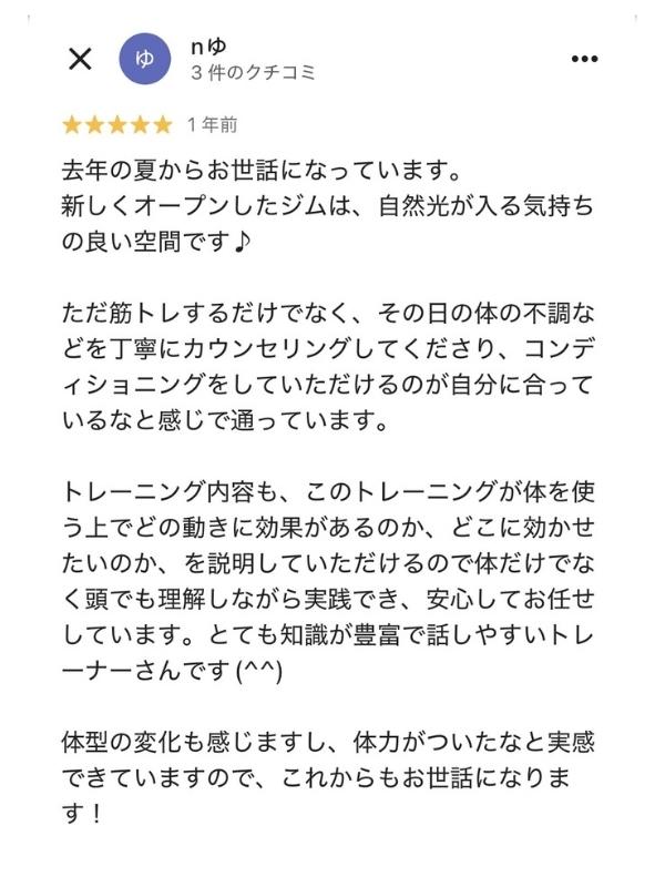 不調があれば負担のない部位のトレーニングをしてくれるし、トレーニング後には筋肉がパンプして気持ち良いです。